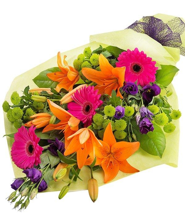 An eye catching bouquet that's simply bursting with colour. Orange Lilies, cerise Gerberas, purple Lisianthus and green Spray Chrysanthemums.
